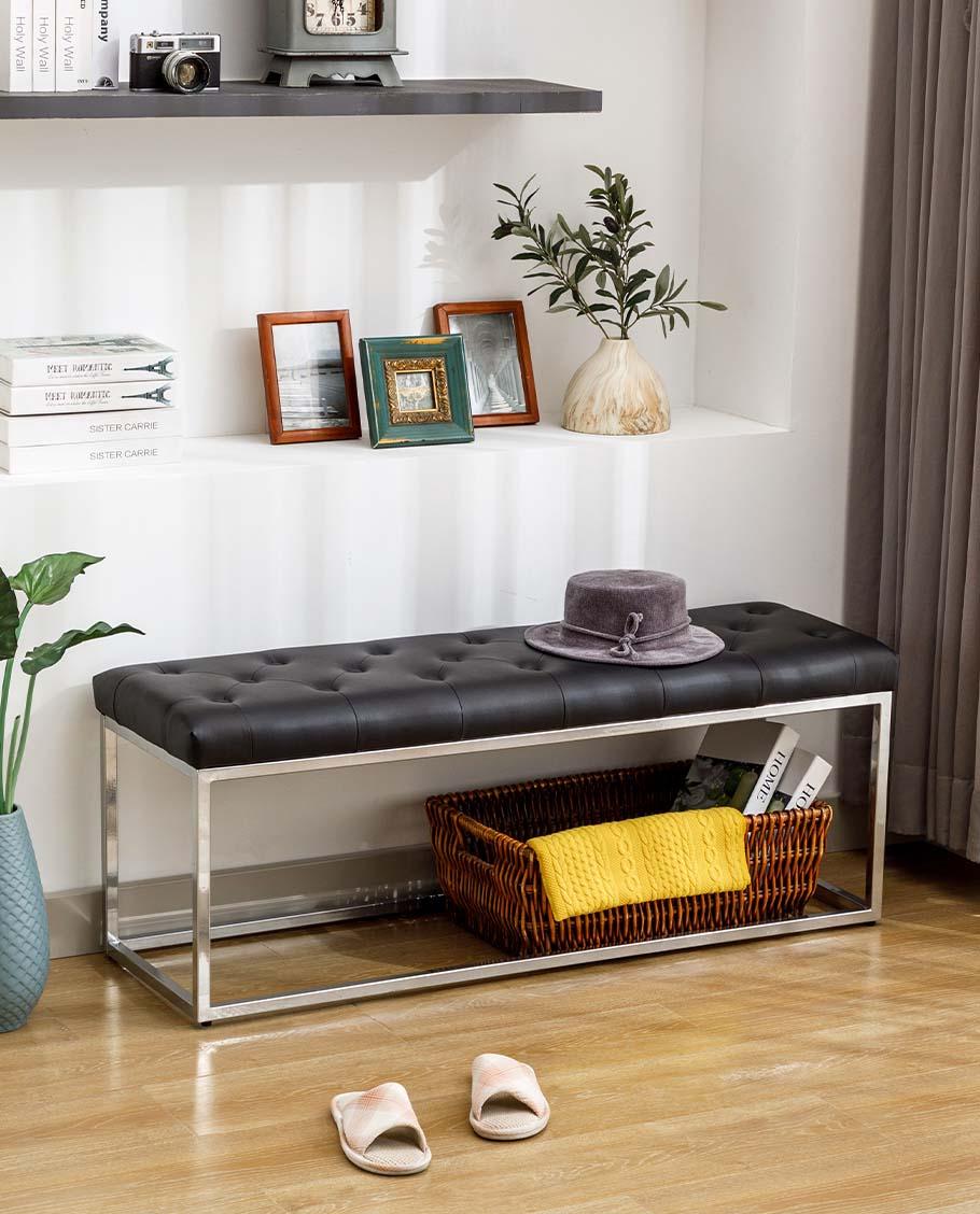 Measuring 47″ long and showcasing a clean-lined yet open rectangular silhouette, our button tufted bench would also be a sneaky way to hide your shoes after you take your shoes off, or add some storage baskets for daily organization if needed. A centerpiece that will blend seamlessly into your living room seating group, entryway or hallway and stationed at the foot of your bed!