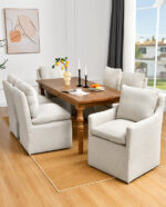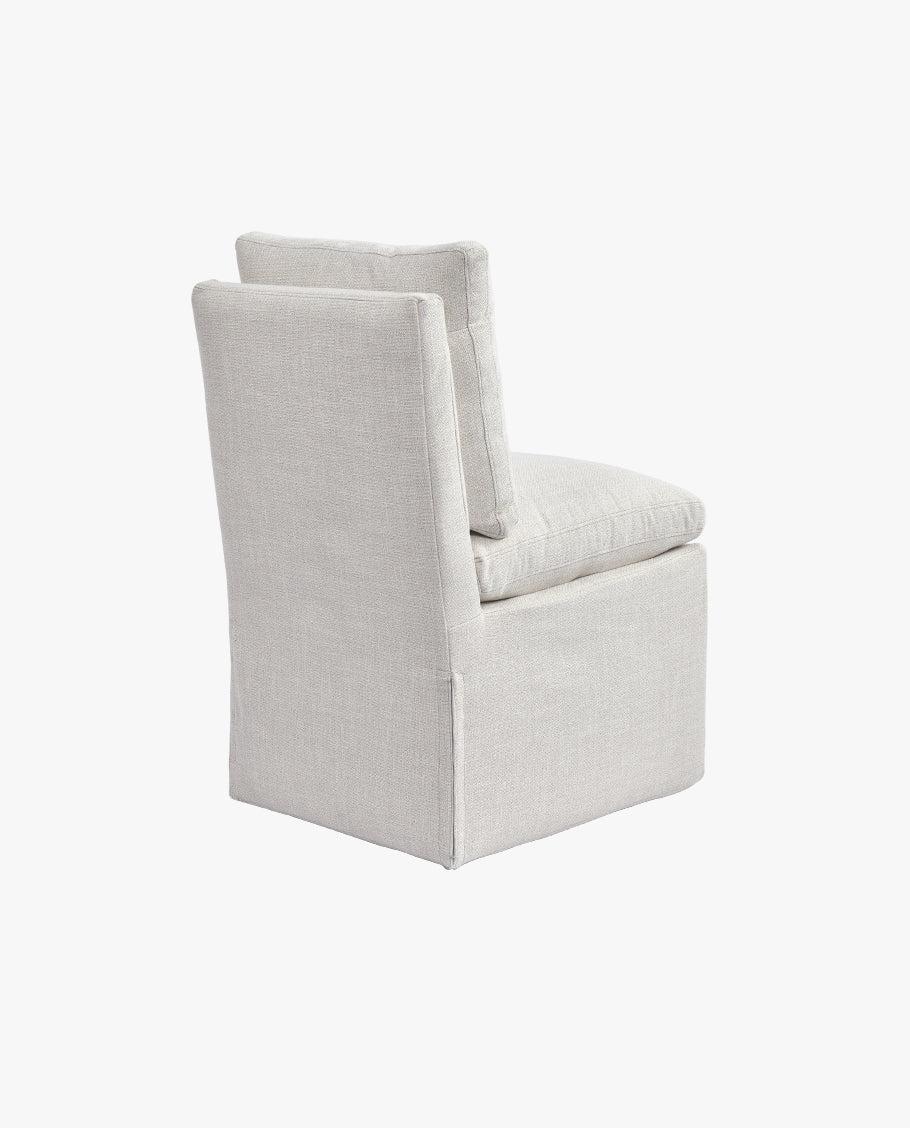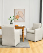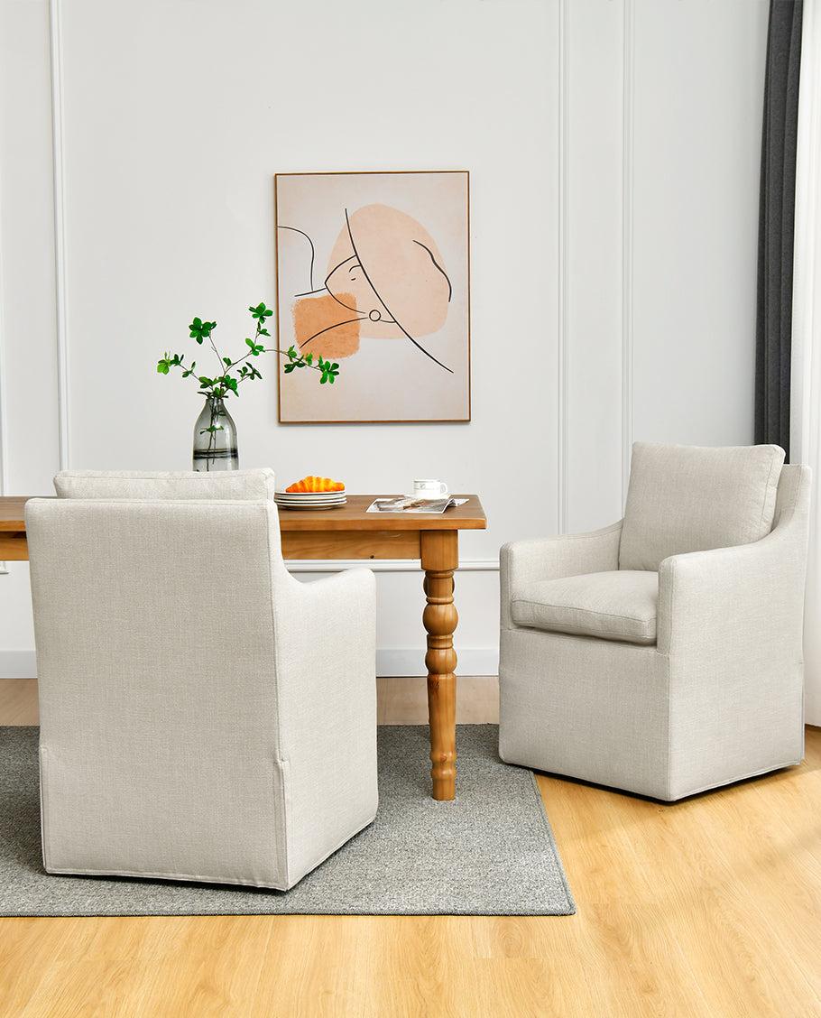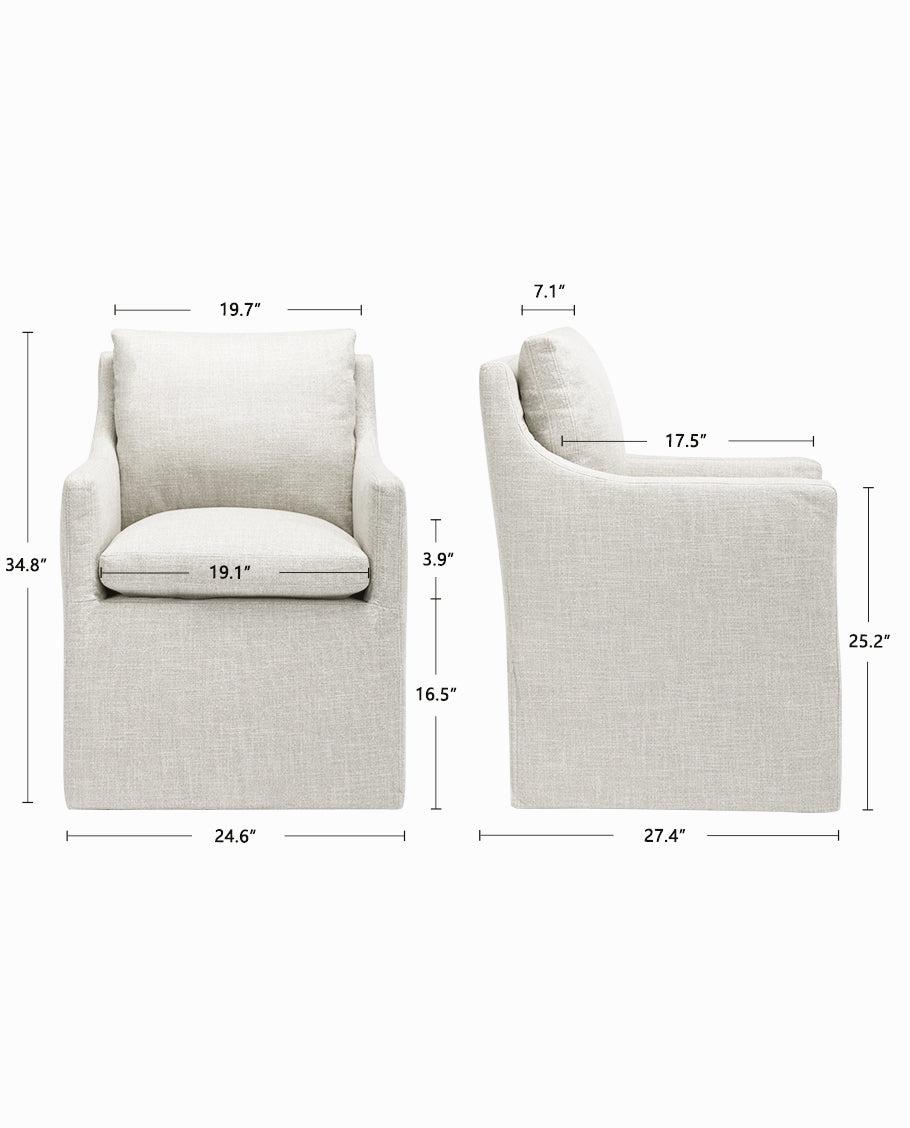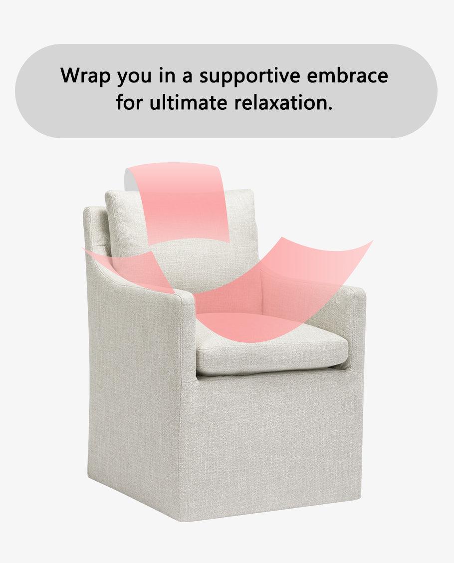 The free-thinking town of Denton lives on through our Denton upholstered rolling dining chair. Its breathable faux linen upholstery over an ultra-soft cushion allows you to sit back and relax. Whether enjoying a home-cooked meal with family or working on your laptop, the plush seat lets you sit pretty for hours. Moreover, the armrest?version gives your arms the perfect place to rest when engaging in pleasant conversations with friends over dinner or a drink. The wooden frame is expertly crafted to provide maximum comfort and sturdiness while remaining hidden under the slipcover for a polished look.